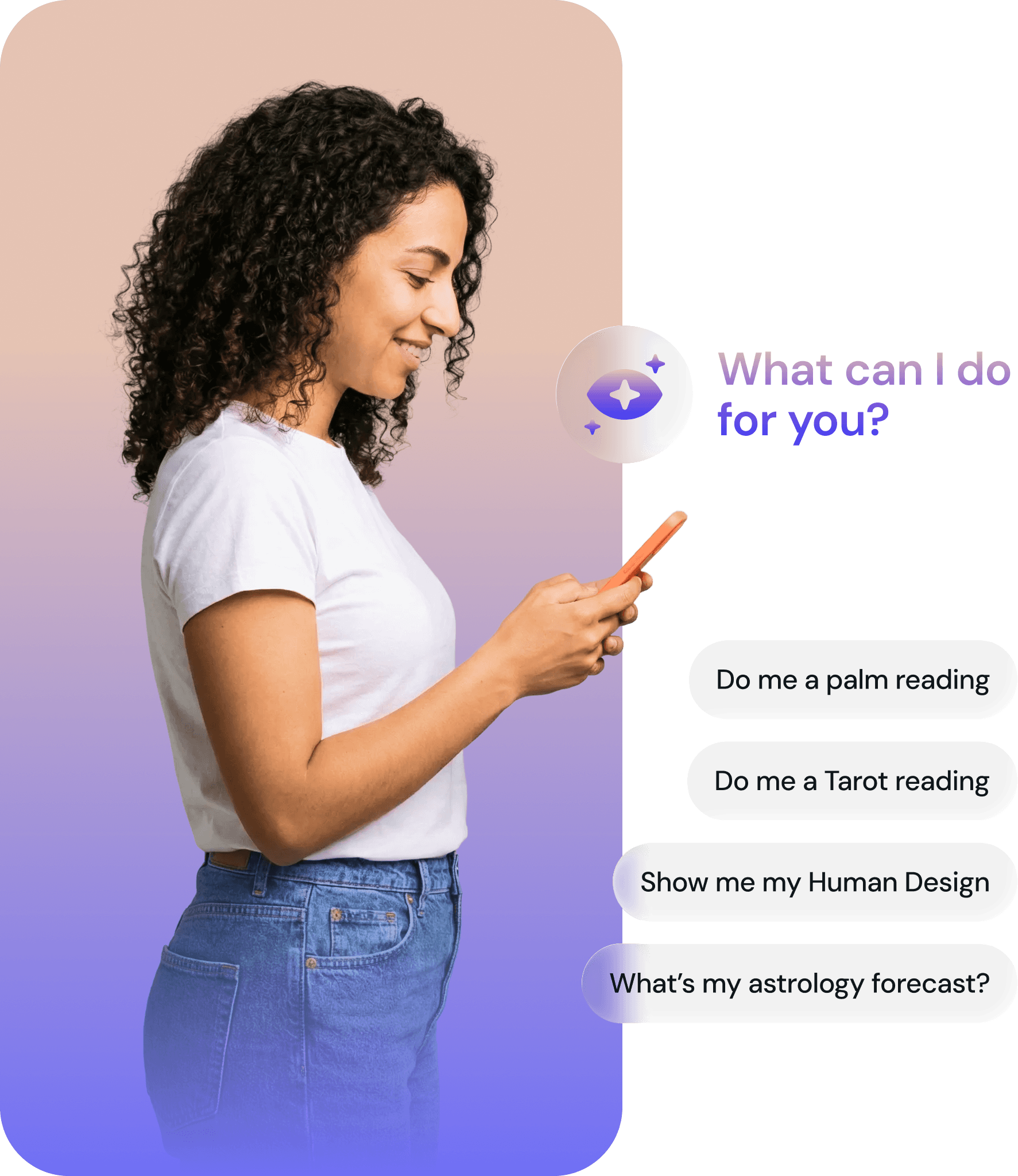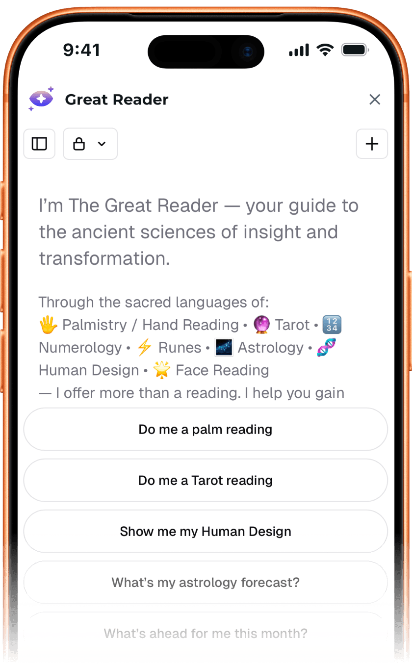 The Great Reader AI is carefully trained using insights from world-class specialists across astrology, numerology, tarot, and human design - distilled into one warm, grounded guide you can chat with anytime.
